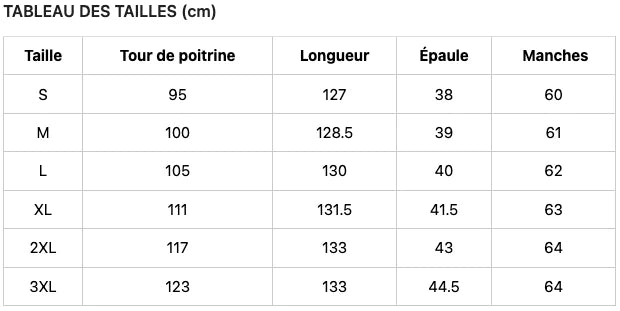 Remarque: Si vous hésitez entre deux tailles, nous vous recommandons de choisir la taille supérieure.