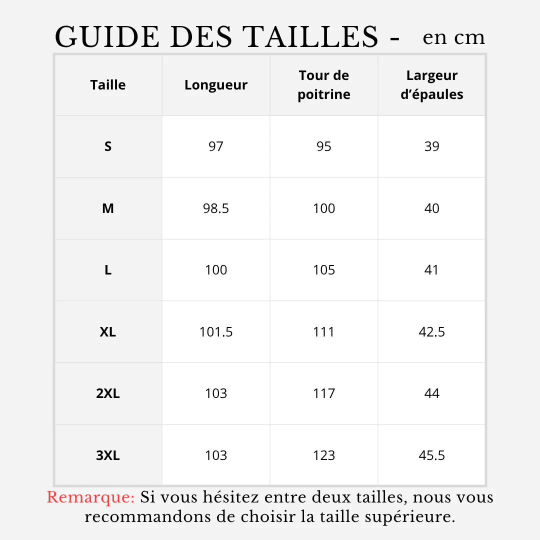 Remarque: Si vous hésitez entre deux tailles, nous vous recommandons de choisir la taille supérieure.